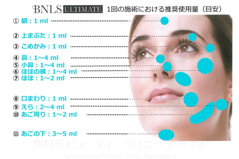 BNLSは施術部位に対して、必要量を正確に、そしてバランス良く注射する必要があります。しかし、凹ませるべき部分が注射時には膨らむため、施術の難易度が比較的高く、さらに、組織に薬液を浸透させる方法にもノウハウが存在するため、術者の技量によって仕上がりが大きく左右されます。イラストは、1回の施術における推奨使用量の目安を示しております。