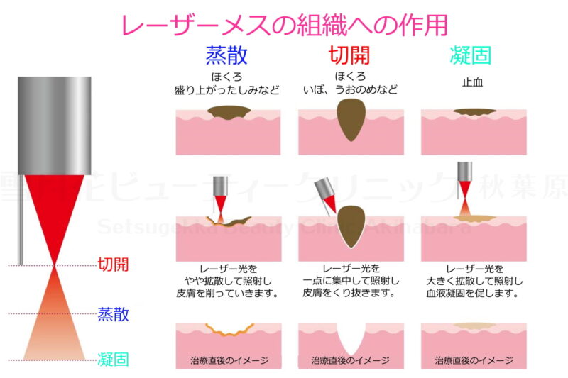 CO2レーザー:レーザーによる蒸散作用と切開作用により、主に膨らみのある病変の除去に用いられます。(当ページ記載)