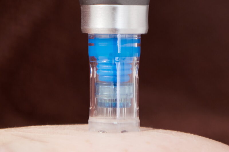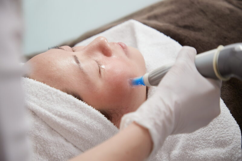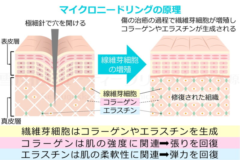 専用の機器を用いて、多数の極細針を皮膚の真皮層にまで刺入する各種施術を総称して、マイクロニードリングと呼びます。針による細かい傷が治癒する過程において、線維芽細胞が増殖することで、コラーゲンやエラスチンなどの、肌の張りや弾力に関わる成分が大量に生成されます。その結果、肌は若々しい状態へと再生され、しわ、ニキビ跡、毛穴の開きなどの症状を改善します。さらに、施術時の針穴から薬剤を浸透させることで、薬剤の効果を最大限に引き出す導入作用も期待できます。
