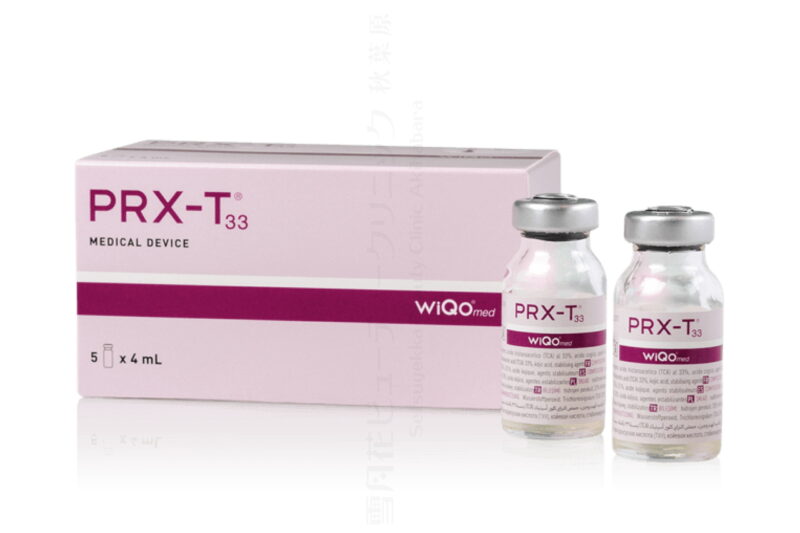 PRX-T33は、マッサージピールと呼ばれる施術で用いられる薬剤で、真皮層におけるコラーゲンの生成促進作用と、しみや肝斑の改善作用があります。ダーマペンとPRX-T33は、コラーゲンの生成促進という共通の作用を持つため、相乗的な肌質改善効果が高く、相性が抜群に良いと言われています。ダーマペンの使用後にPRX-T33の塗布を行うコンビネーション施術を、通称ヴェルヴェットスキンといいます。