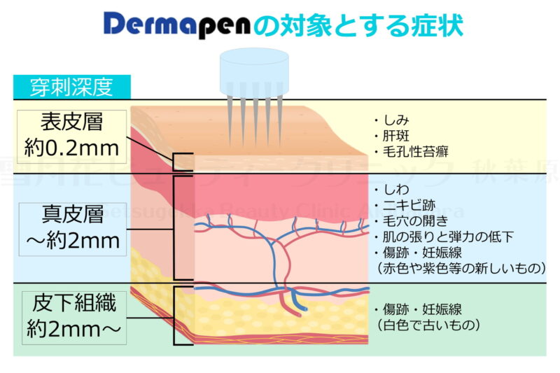 ダーマペンは、針を刺す深さを0.2mmから3.0mmまで調整することが可能で、その深さによって対象とする症状が異なります。ごく浅い表皮層に刺入した場合は、メラニンによる色素性疾患に効果があります。それより深い真皮層に刺入すると、コラーゲンやエラスチンの生成による肌質改善効果が期待できます。さらに深くの皮下組織にまで刺入すると、傷跡や妊娠線などの凹凸を改善する作用があります。