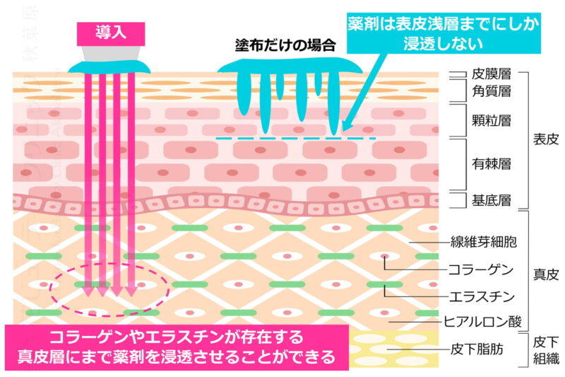 健康な皮膚には本来、異物の侵入を阻害するためのバリア機能が働いています。そのため、化粧品や美容液を皮膚の表面に塗布したとしても、表皮のごく表層にしか浸透せず、効果は限られたものになります。しかし、肌の張りや弾力に関係し、美しさや若さを保つコラーゲンやエラスチンなどの成分は、皮膚の深部の真皮層に存在するため、美容を目的とした薬剤は、なるべく深くにまで浸透させてこそ、本来の効果が得られます。導入とは、皮膚のバリア機能を突破して、有効成分を皮膚の奥深くにまで浸透させるための、さまざまな方法のことを指します。