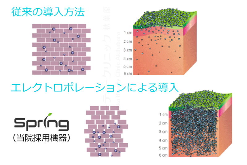 エレクトロポレーション:専用機器を用いて電気パルスにより、皮膚の細胞間に隙間をつくり、薬剤を肌に浸透させていく最新の方法です。水溶性のみならず脂溶性の物質や、高分子物質も導入可能です。
