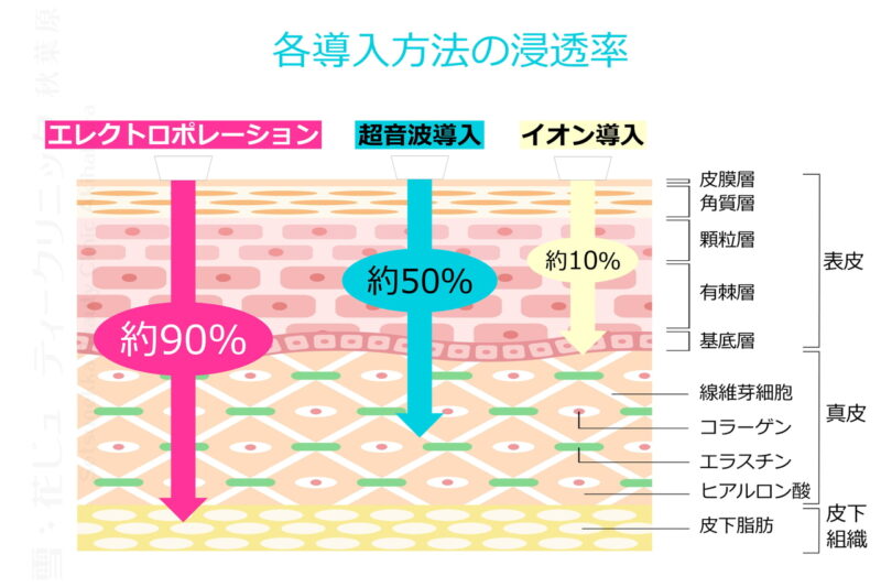 イオン導入:導入しようとする薬剤に、微弱電流を流すことによりイオン化し、マイナスイオン同士が反発する力を利用して、肌に浸透させやすくする方法です。水溶性の低分子物質しか導入できません。