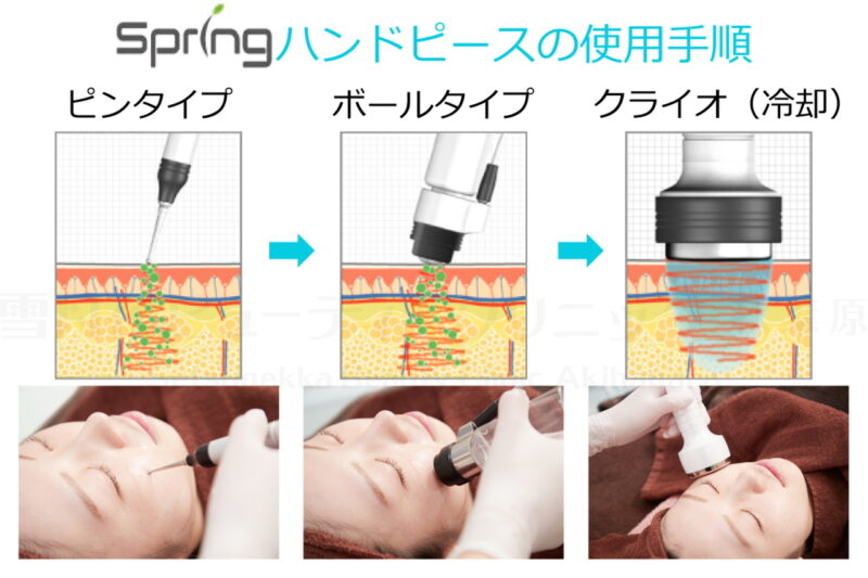 - 使用する薬剤を塗布した後に、ピンタイプのハンドピースを使用して、電気パルスにより皮膚の細胞間に隙間を作ります。