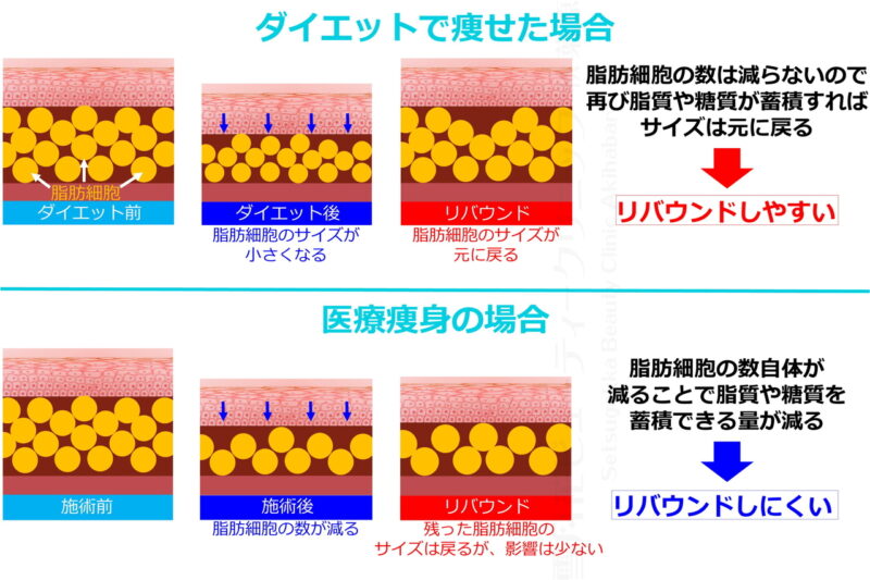 当施術は、脂肪細胞数を減少させる医療痩身であるため、通常の脂肪燃焼によるダイエットと比較して、リバウンドしにくいのが特徴です。ただし、その後の生活習慣によっては、脂肪細胞が肥大化し分裂することにより、リバウンドしてしまう可能性もあります。
