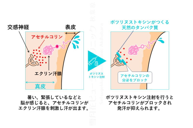 多汗症に対する治療として、A型ボツリヌストキシン製剤を、発汗が気になる部分に注射する方法があります。この薬剤は、エクリン汗腺に発汗を促す神経伝達物質である、アセチルコリンを阻害することより、3~6カ月の期間にわたり、注射した部分の汗を強力に抑制します。短時間の施術で高い効果が期待でき、即効性もあるため、脇汗に伴う汗ジミやニオイにお悩みの方にお勧めできる治療法です。