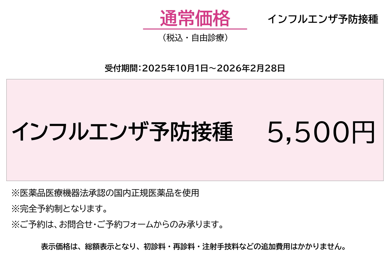 患者様からのご要望が多い、インフルエンザ予防接種を10月~翌3月までの限定メニューとして設定しております。当サイトのWebフォーマットからのみの完全予約制となり、電話でのご予約は承っておりません。混雑なしに予防接種を受けたい方におすすめです。