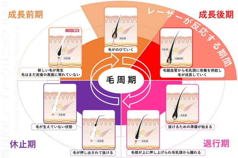 すべての毛には成長期→退行期→休止期という毛周期(ヘアサイクル)があり、成長期にある毛のみがレーザーに反応します。そのため、一定期間をあけて繰り返し照射を行うことにより、永久脱毛を実現します。
