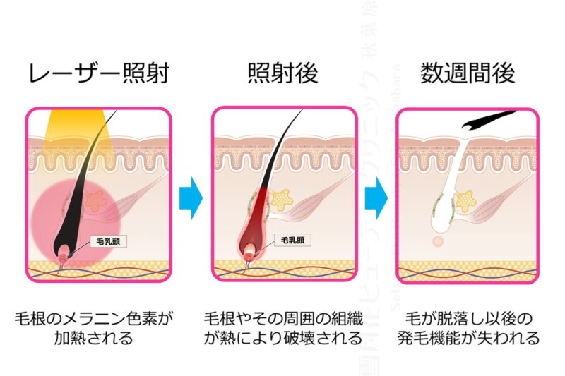 毛根や毛には、黒色のメラニン色素が多く含まれています。剃った毛に対して、特定の波長のレーザーを照射すると、メラニン色素において光エネルギーが熱エネルギーに変換されて超高熱になります。その結果として、毛根やその周囲も急速に加熱され、細胞破壊により、発毛機能が永久に失われます。