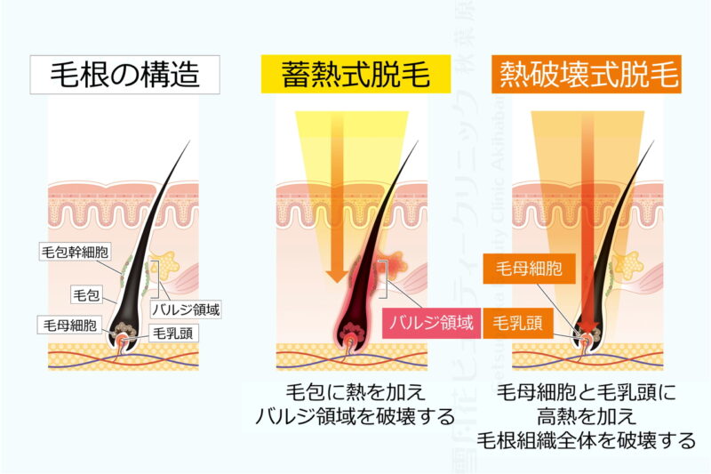 熱破壊式脱毛:高いエネルギーのレーザーを1回のみ照射します。毛乳頭や毛母細胞など、発毛にかかわる毛根細胞が、高熱により完全に破壊されることから、毛はすみやかに抜け落ちるとともに、以後の発毛が不可能になります。