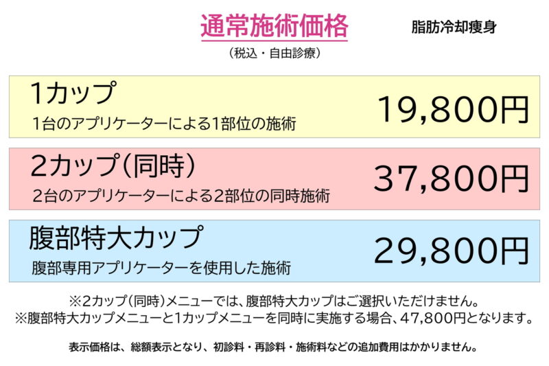 顎周り・二の腕・胸周り・背中・腹部・脇腹・腰周り・お尻の下・太もも周り・膝上など、全身の幅広い部位の施術に対応するため、複数のサイズと形状のアプリケーターをご用意しております。腹部の分厚い皮下脂肪に対応する大型アプリケーターの使用時のみ、別価格となりますが、それ以外は、部位やアプリケーターの種類によらず、価格は一定です。2部位までの同時施術が可能であり、その場合はさらにお得な価格設定となっています。