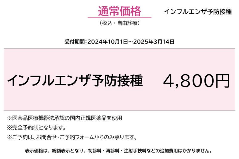 - 使用するワクチンはすべて、医薬品医療機器法承認の国内正規医薬品ですが、予防接種は健康保険適用外であるため、上記のメニューは自由診療となります。