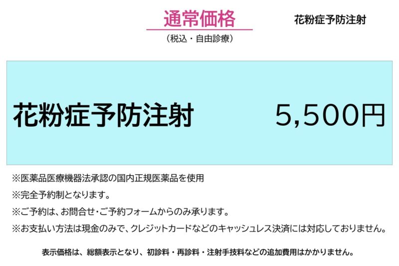 - 当注射にて使用する薬剤は、医薬品医療機器法承認の国内正規医薬品ですが、通常の花粉症に対する使用は承認外であるため、当ページに記載のメニューは自由診療となるほか、有害事象が生じた場合にも、医薬品副作用被害救済制度の救済対象になりません。