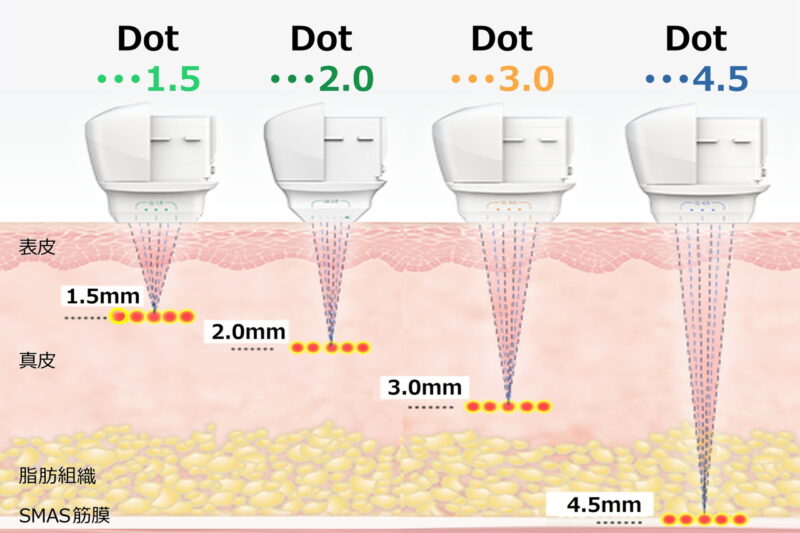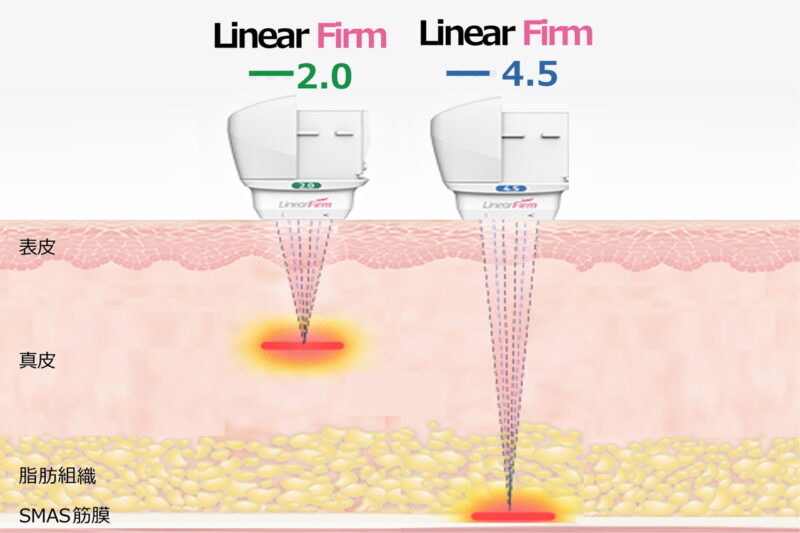 照射深度・照射範囲・照射パターンの異なる多くの交換式カートリッジにより、症状に応じた柔軟な照射を実現する、韓国Jeisys社の最新HIFU機器です。しわやたるみ、肌質改善を目的とした通常カートリッジに加え、世界初かつ唯一の、脂肪溶解に特化したLiniarFirmカートリッジの追加により、二重あごなどのフェイスラインに対する効果も期待できます。最低限の加熱による短時間照射を可能とした設計により、安全性の向上に加え、照射時の痛みを大幅に緩和し、快適な施術を実現しています。