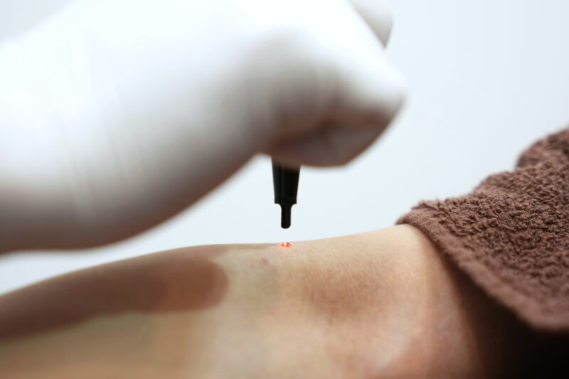 CO2レーザーとは、炭酸ガス(二酸化炭素)を用いて分離される、遠赤外線領域の長波長レーザー光線を出力する機器のことです。皮膚に照射されたレーザーの光エネルギーは、皮膚の中の水分に吸収されて熱エネルギーに変換され、一瞬で周囲の組織を焼却し蒸発させます。この作用により、ほくろやいぼなどの膨らみを持った病変を削り取るのに用いられます。病変を除去した部分は、健常な組織により上皮形成され、次第に目立たなくなるため、メスを用いて切除するより美しく仕上がるのが特徴です。