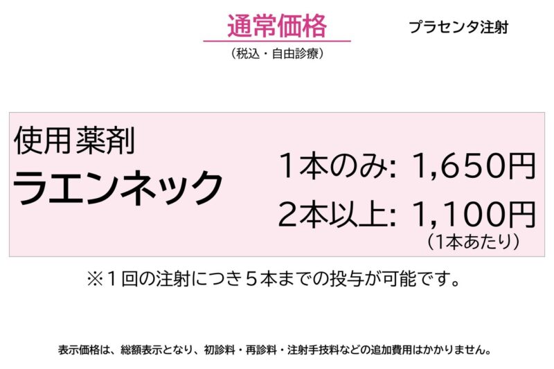 医薬品医療機器法承認の国内正規医薬品であり、ヒトの胎盤由来のプラセンタ製剤として、日本でもっとも実績のある製品です。投与方法は筋肉注射のみとなり、当院ではメーカーが禁止している血管内への静脈注射・点滴などは一切行っておりません。注射の頻度や、1回の注射における最適な投与量(本数)は、体重や体格、目的などにより異なりますため、診察時に医師とご相談ください。